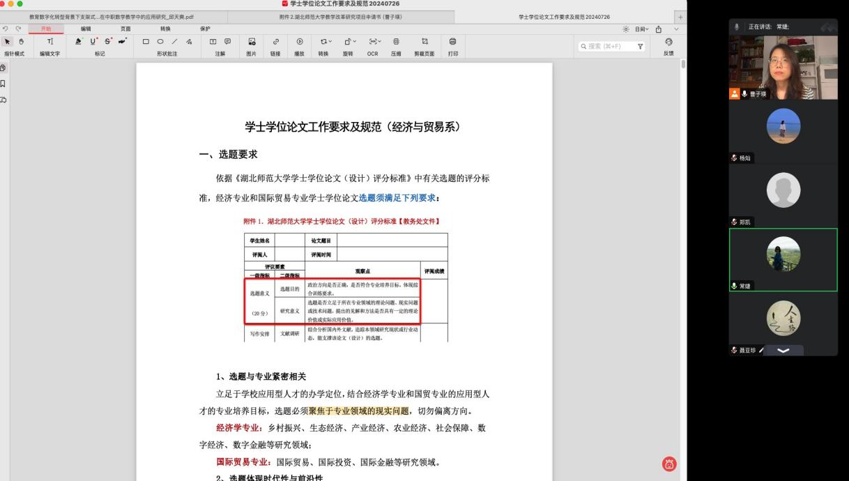 本次活动对经济学专业及国际贸易专业的学士论文的要求进行了修订,具体涉及选题要求、毕业论文拟题规范、论文正文撰写要求、论文格式规范等四个方面,对此进行了详细的解读与讨论。