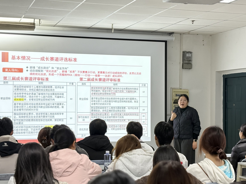 本次培训内容紧扣大赛核心要求,从“成长赛道方案解读”“备赛建议”“避坑指南”“优秀职业生涯规划书展示”四大模块展开。首先,王老师讲述了职业规划大赛的两条赛道——成长赛道和就业赛道,并阐述二者区别及报名条件,帮助参赛选手精准把握备赛方向。接着,王老师分别从职业目标、学习实践行动、优化改进这三个方面来向学生讲述成长赛道评审标准,帮助参赛选手很好地了解到了成长赛道的具体情况。而针对材料撰写,老师则提出“有特色”“有逻辑”“有料”“有温度”的四维度要求,结合“小逻辑”“大逻辑”框架,指导选手通过“要什么、有什么、差什么”等问题梳理职业目标,同时融入自身专业核心优势,让规划书极具个人专属风格。培训最后,王老师向我们展示了历届优秀的职业生涯规划报告书并结合往届案例解读,同学们认真听讲、做好笔记,现场学习氛围浓厚。