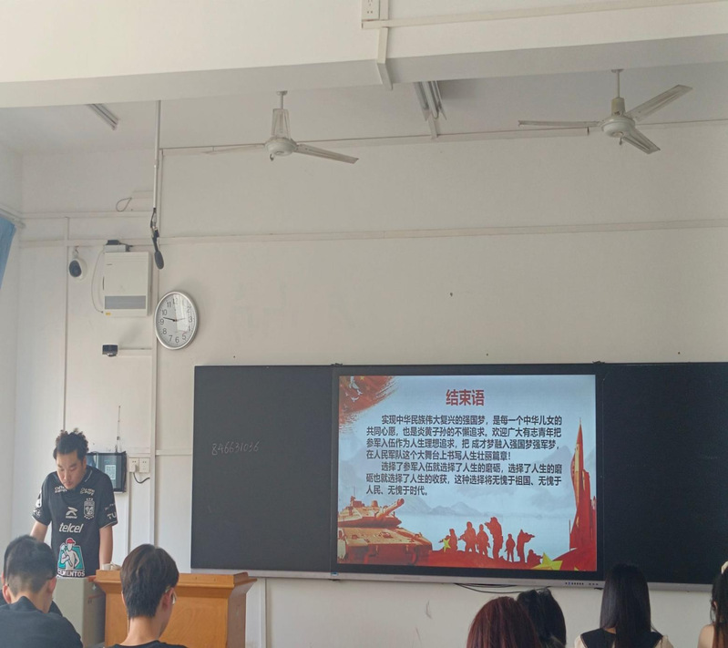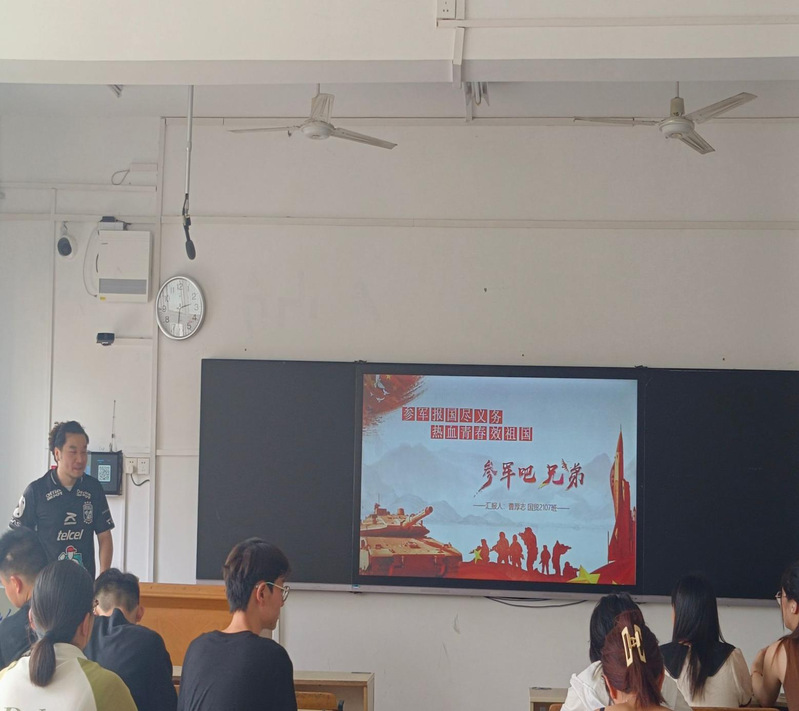 为进一步弘扬爱国主义精神,激发广大青年学子的参军热情,促进学生进一步了解应征入伍的相关政策,经管法学院退役学生服务部于6月16日在教育大楼1202开展“热血青春,青春报国”的活动。主讲人退役学长2107班曹厚志。