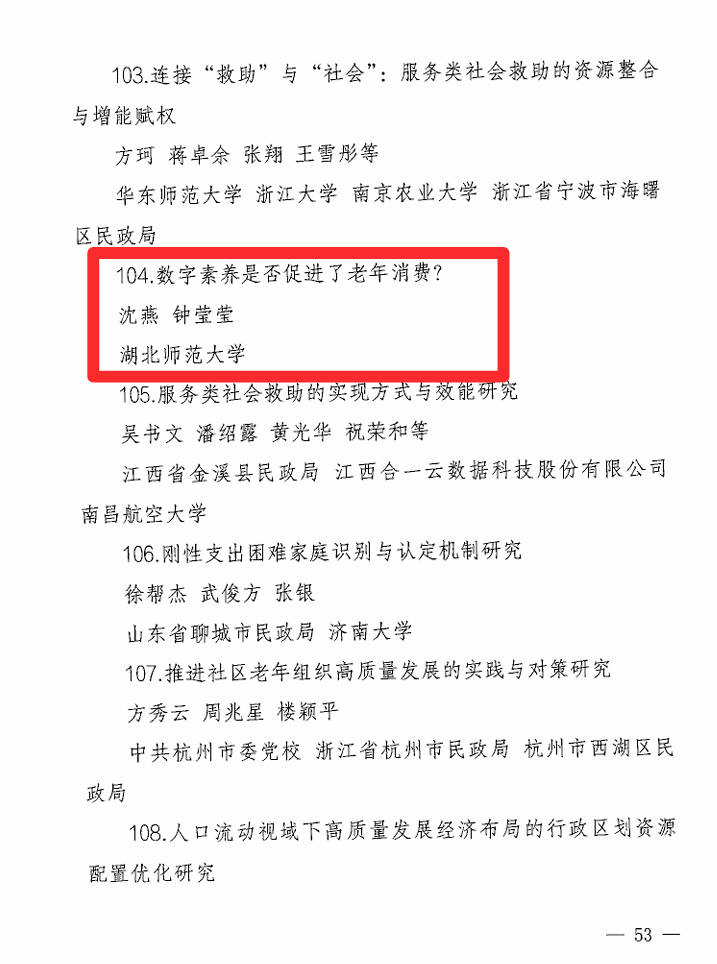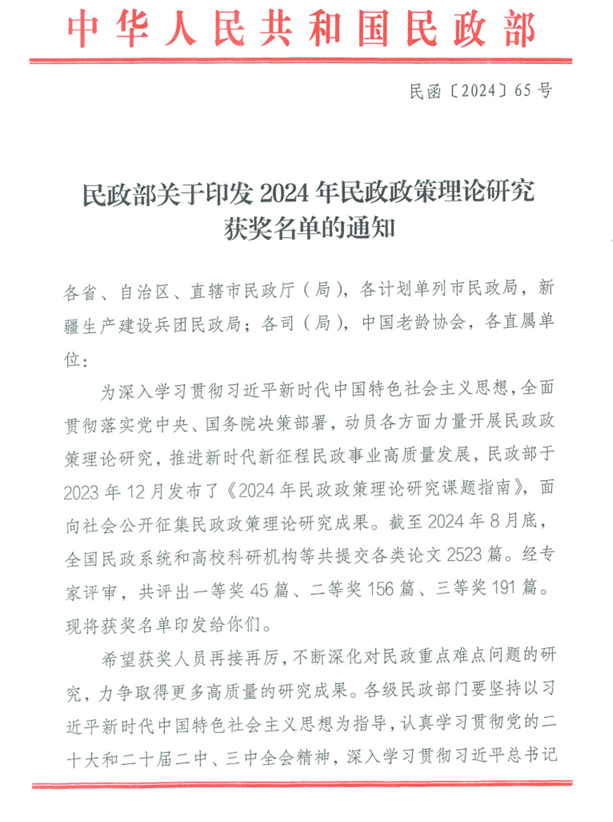 为深入学习贯彻习近平新时代中国特色社会主义思想,全面贯彻落实党中央、国务院决策部署,动员各方面力量开展民政政策理论研究,推进新时代新征程民政事业高质量发展,民政部面向社会公开征集民政政策理论研究成果。截至2024年8月底,全国民政系统和高校科研机构等共提交各类论文2523篇。经专家评审,共评出一等奖45篇、二等奖156篇、三等奖191篇。由我院副院长沈燕教授指导,2023级应用经济学研究生钟莹莹主笔的研究论文《数字素养是否促进了老年消费?》荣获民政部2024年民政政策理论研究三等奖。这是我院研究生的科研成果首次入围并斩获该领域国家级奖项,标志着我院在研究生培养方面取得历史性突破。