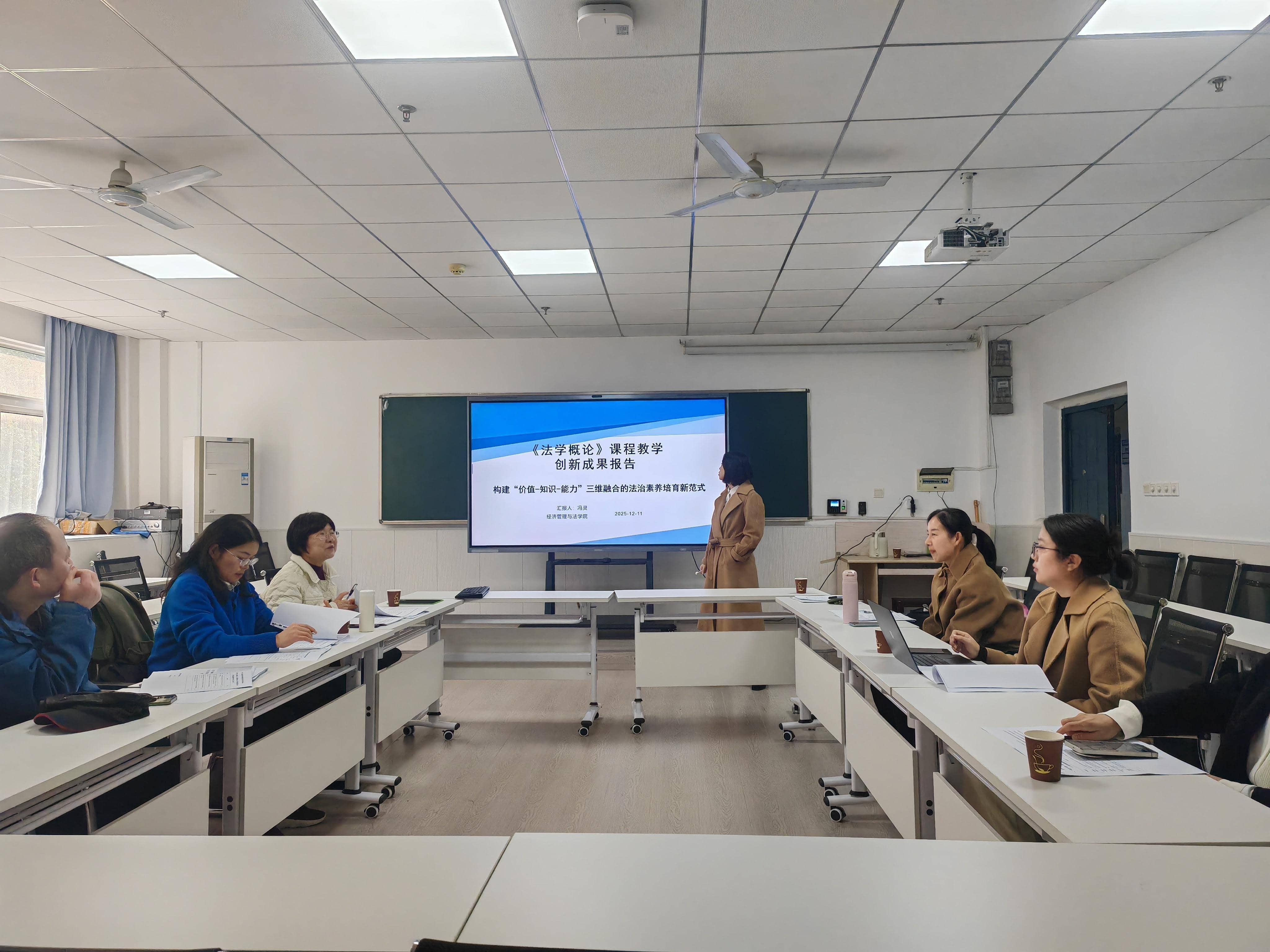 冯灵、叶菁、徐玺和赵贤利四位参赛教师按照抽签顺序依次汇进行,围绕课程教学目标、创新教学设计、教学实施过程及教学成效等方面展开精彩汇报。他们结合各自授课课程的特点,生动展示了在教学理念创新、教学方法改革、人工智能应用等方面的创新探索。赵贤利老师以管理学课堂教学痛点为抓手,提出了“思政引领、AI驱动、五融五塑”课程思政创新教学模式;叶菁老师则聚焦“物权法”课程案例教学,以德法融合,学创共生为理念,分享了如何将法律条文与社会主义核心价值观相结合,在案例教学中潜移默化地培养学生的法治精神和责任意识。汇报过程中,教师们思路清晰、表达流畅,充分展现了我院教师积极投身教学创新的热情与专业素养。